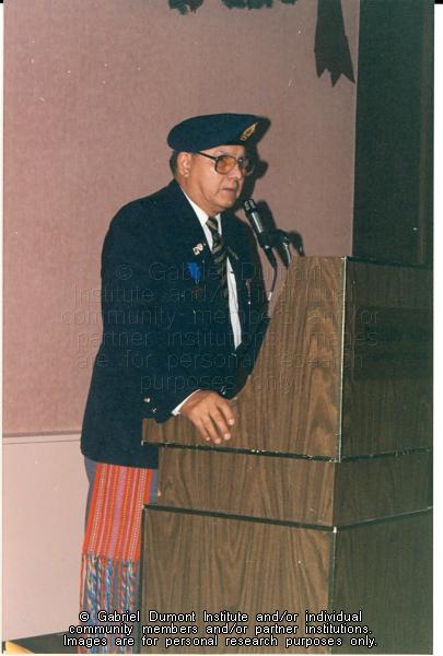| Description: | Frank Tomkins at the Saskatoon launch of Remembrances: Interviews With Métis Veterans. |