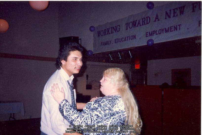 | Description: | Lee Rajc dancing with a student at a Gabriel Dumont Institute graduation. |