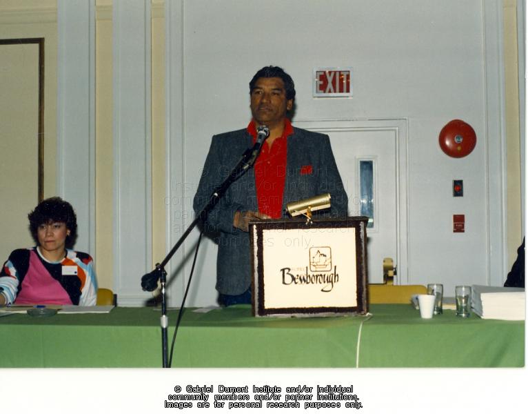 | Description: | Gabriel Dumont Institute staff member Terri MacPhail looks on as Jim Sinclair speaks. |