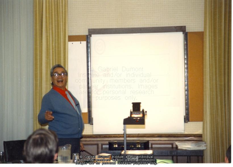 | Description: | Tommy Francis leading a session at a Gabriel Dumont Institute cultural conference. |