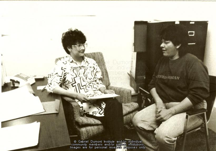 | Description: | An Institute staff member talking to a Gabriel Dumont Institute student. |