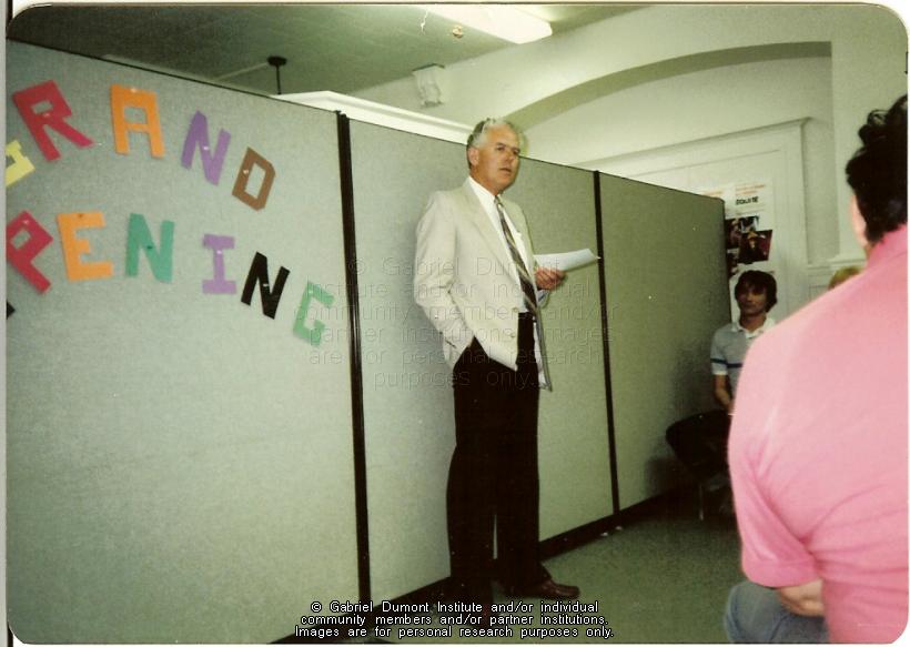 | Description: | Dignitary at the grand opening of the Gabriel Dumont Institute in Prince Albert in 1988. |