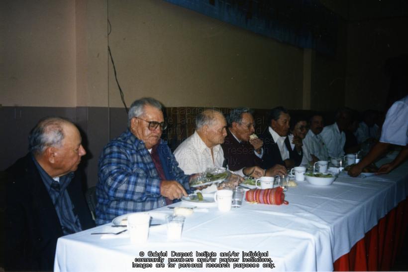 | Description: | Elders at a banquet table, including Edward King and Vital Morin. This group could be Senators for the Métis Society of Saskatchewan. |