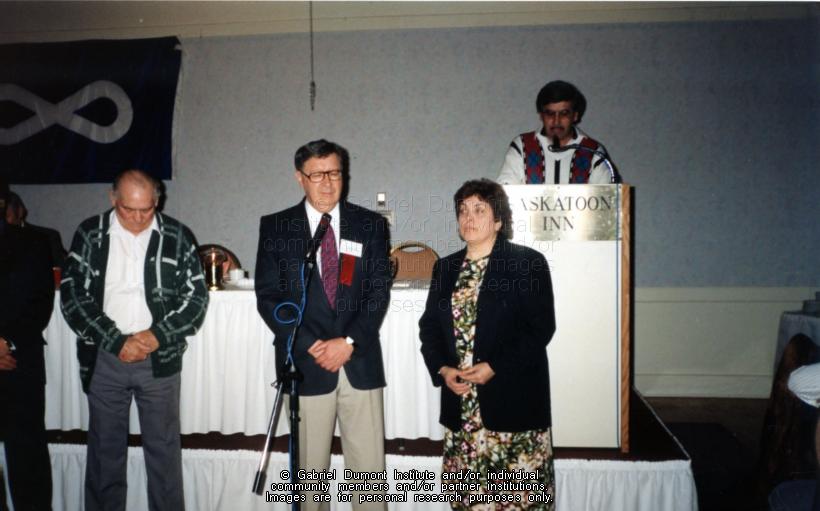| Description: | Vital Morin, Albert Robillard (centre), and May Henderson at a public event, John Dorion is at the podoum. |