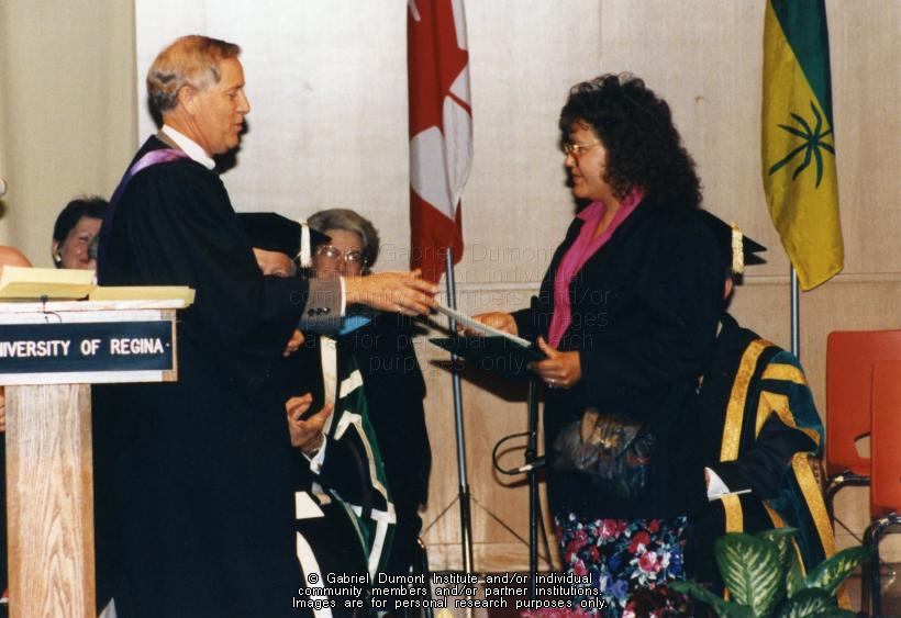 | Description: | A Gabriel Dumont Institute student receiving her degree/diploma. |
