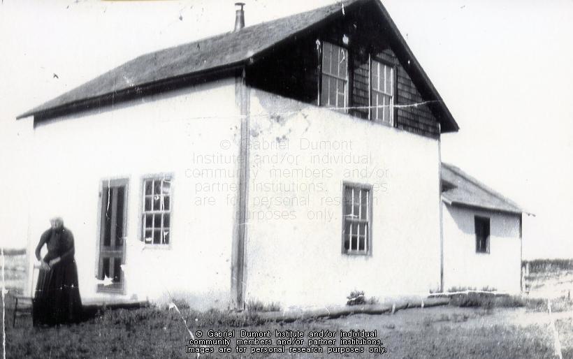 Description: The Métis women at Batoche, Josephte (Paul) Tourond (1831-1928) (pictured in the photograph in front of Edmond and Berthe Boyer’s home at Batoche) and Marguerite (Dumas) Caron were of Cree or Ojibway and French Canadian origin. They still spoke Cree or Saulteaux and practiced traditional medicine. They remained between two worlds and were forced to resort to war to defend their freedom and homeland in 1870 and 1885. Their persistence and pride ensured that Batoche remained a Métis community. Source: Brenda Boyer-Percell. This image must not be reproduced. The original source of this image is with Estelle Boyer.