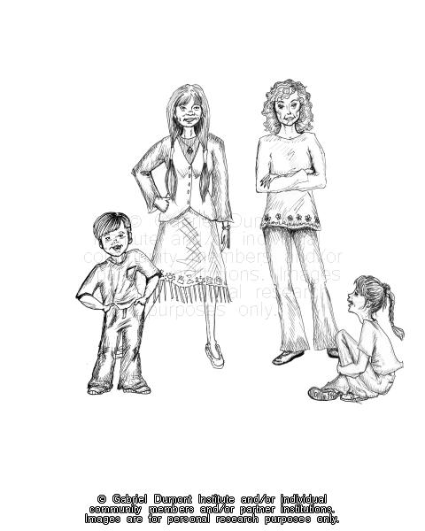 Sketch by Carrie Saganace of a little boy, little girl, Métis woman, First Nations woman, and Kokum. Created for the Saskatoon Indian and Metis Friendship Centre. Copyright remains with the Gabriel Dumont Institute. |