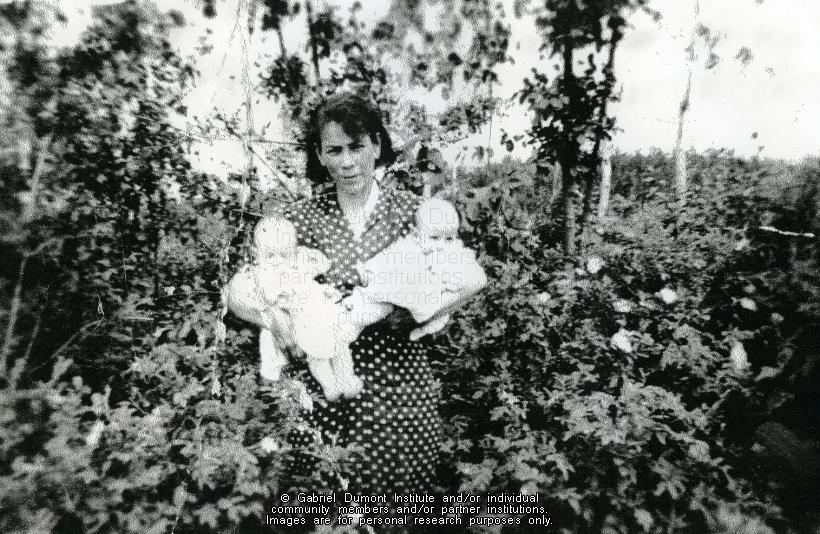 Description: Avelina (Vilna) Fiddler holding twins Susy and Shirley Delaronde, daughters of Helen St. Germaine and Paul Delaronde. This image is to be used for research purposes only. The reproduction of this image in whole or in part is strictly prohibited without the permission of the copyright holder. Copyright for this image belongs to Lawrence Arnault, and/or the person(s) in the photograph, and/or their descendants.