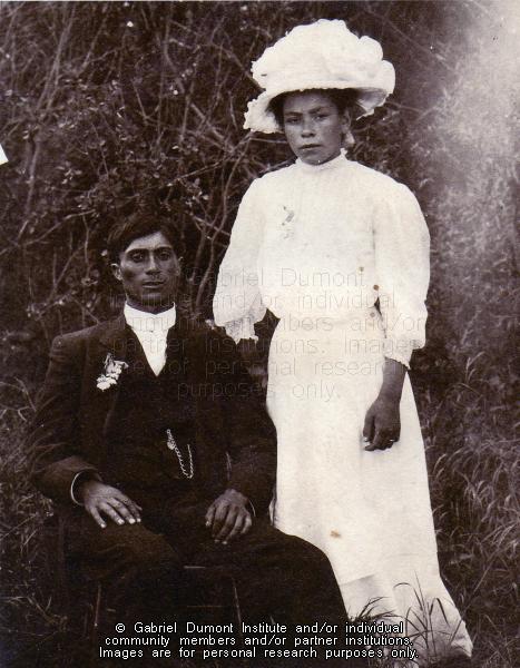 Wedding day of William (Gore no) Fiddler (d. 1972) and Aveline (Vilna) Delaronde (d. 1978). This image is to be used for research purposes only. The reproduction of this image in whole or in part is strictly prohibited without the permission of the copyright holder. Copyright for this image belongs to Lawrence Arnault, and/or the person(s) in the photograph, and/or their descendants. |