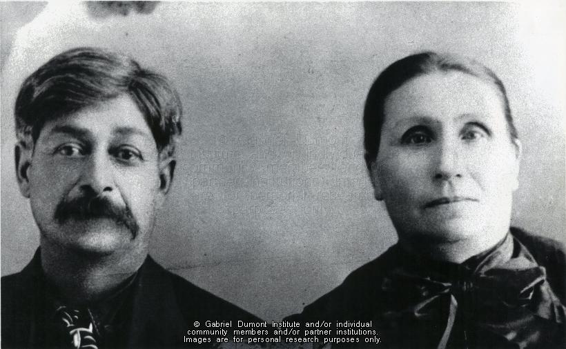 Baptiste Fiddler (1862-1949) and his wife Veronica (née Gervais) (1867-1959). Baptiste was the son of Francois Fiddler and Josephine Laplante. Veronica was the daughter of Cleophas Gervais and Catherine Ross. This is not a wedding picture, but Baptiste and Veronica were married on 21 September 1884. This image is to be used for research purposes only. The reproduction of this image in whole or in part is strictly prohibited without the permission of the copyright holder. Copyright for this image belongs to Lawrence Arnault, and/or the person(s) in the photograph, and/or their descendants |