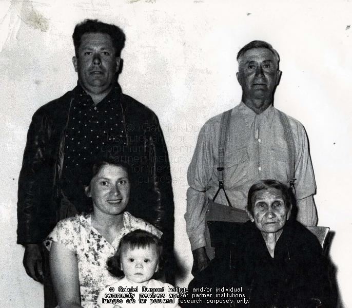 A five generation photo. Seated are Evelyn Arnault (née Fiddler) (left), holding Marilyn Arnault (later to become Mrs. Ronald Bundschun) and Veronica Fiddler (née Gervais). Standing are Max Fiddler (left) and William Fiddler. This image is to be used for research purposes only. The reproduction of this image in whole or in part is strictly prohibited without the permission of the copyright holder. Copyright for this image belongs to Lawrence Arnault, and/or the person(s) in the photograph, and/or their descendants. |