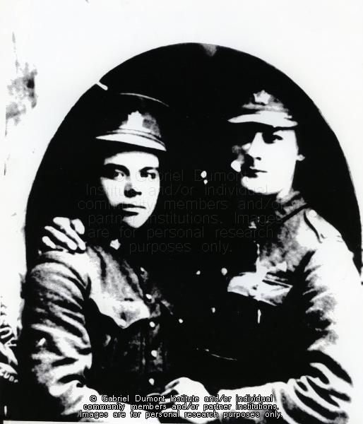 Emilien Laliberte (left) and Johnny (Wah tsus) Laliberte. These first cousins were veterans of WWI. This image is to be used for research purposes only. The reproduction of this image in whole or in part is strictly prohibited without the permission of the copyright holder. Copyright for this image belongs to Lawrence Arnault, and/or the person(s) in the photograph, and/or their descendants. |