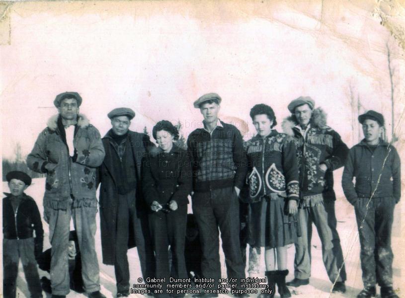 The six adults standing left to right are: August Roy, Moise Merasty, Mary Fulton (née Laliberte), Bernard Laliberte (brother to Mary), Theresa Laliberte, and George Lafleur. This image is to be used for research purposes only. The reproduction of this image in whole or in part is strictly prohibited without the permission of the copyright holder. Copyright for this image belongs to Lawrence Arnault, and/or the person(s) in the photograph, and/or their descendants. |
