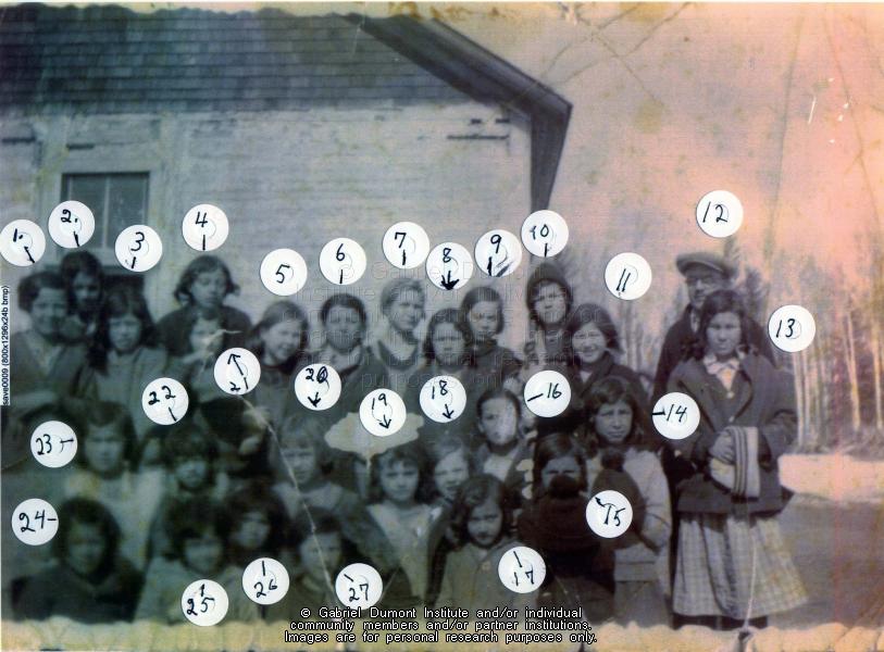 1. Julie Laliberte 2. Madeline Durocher (daughter of Jean Durocher and Alice Morin) 3. Margaret Laliberte (daughter of Emilien Laliberte and Albertine Morin) 4. Monique Roy (daughter of Gilbert Roy and Flora Sinclair) 5. Norma Wells 6. Antoinette Laliberte (daughter of Emilien Laliberte and Albertine Morin) 7. Ethel Dalpe 8. Mary Merasty (daughter of Norbert Merasty and Flora Morin) 9. Unidentified 10. Ernestine Laliberte (daughter of Baptiste Laliberte and Aldina Morin) 11. Mary Laliberte (daughter of Clement Laliberte and Aldina Morin) 12. Teacher 13. Margaret Lachance (daughter of Jonas Lachance and Josephine Iron) 14. Madeline Valle (daughter of Louis Valle and _____ Bird. Madeline married Marcel Laliberte) 15. Daughter of Narcisse Merasty and Rosa Villebrun 16. Daughter of Narcisse Merasty and Rosa Villebrun 17. Frances Roy (daughter of Harry Roy and Albertine Laliberte) 18. Unidentified 19. Mary Bishop (daughter of Alex Bishop and Isabelle Fraser) 20. Unidentified 21. Mary Laliberte (daughter of Norbert Laliberte and Josephine Gerard) 22. Alice Laliberte (daughter of Baptiste Laliberte and Aldina Morin) 23. Eliza Durocher (daughter of Jean Durocher and Alice Morin) 24. Violet Sinclair (daughter of Alex Sinclair and Mathilda Laliberte) 25. Therese Laliberte (daughter of Norbert Laliberte and Josephine Gerard) 26. Elsie Merasty 27. Mary Fulton (née Laliberte) (daughter of Goodwin Laliberte and Rosa Merasty). This image is to be used for research purposes only. The reproduction of this image in whole or in part is strictly prohibited without the permission of the copyright holder. Copyright for this image belongs to Lawrence Arnault, and/or the person(s) in the photograph, and/or their descendants. |