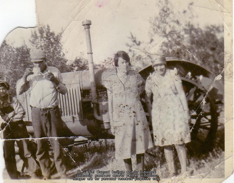 A man sipping a drink with a young boy to his side and two ladies standing in front of a tractor. This image is to be used for research purposes only. The reproduction of this image in whole or in part is strictly prohibited without the permission of the copyright holder. Copyright for this image belongs to Lawrence Arnault, and/or the person(s) in the photograph, and/or their descendants. |