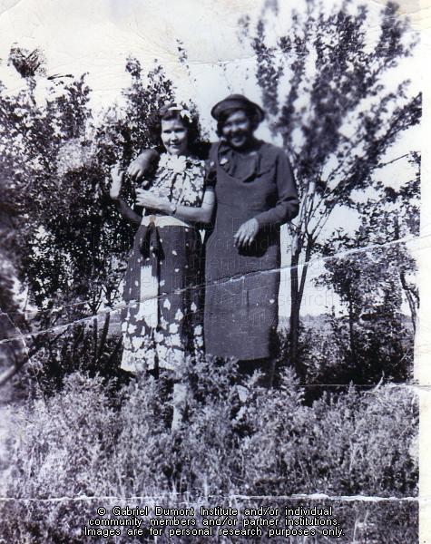 Description: Left, Victoria Laliberte and right, Zilda Chumont on Zilda’s wedding day to Bert. This image is to be used for research purposes only. The reproduction of this image in whole or in part is strictly prohibited without the permission of the copyright holder. Copyright for this image belongs to Lawrence Arnault, and/or the person(s) in the photograph, and/or their descendants.