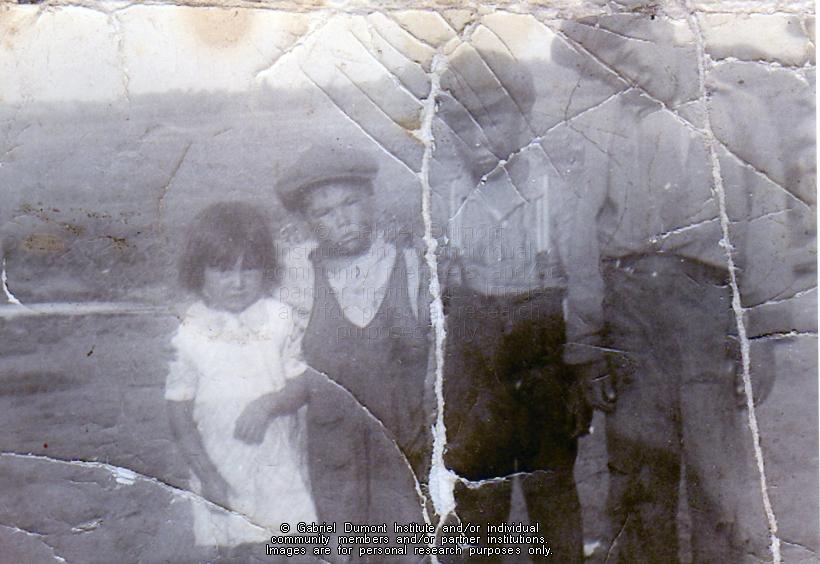 From left to right: Bertha Delaronde, daughter of Josh Delaronde, with her first cousins Leonard, Wilfred, and Eugene Morin. These three boys were the sons of Gaspard Morin and Maria Piche. This image is to be used for research purposes only. The reproduction of this image in whole or in part is strictly prohibited without the permission of the copyright holder. Copyright for this image belongs to Lawrence Arnault, and/or the person(s) in the photograph, and/or their descendants. |