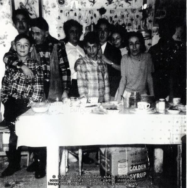 The family of Harry (Wah-tsus) Macallum. Left to right: The two young boys are Louis and Alex Macallum, the adults are Henry, Harry, Lena, Claude Bouchard, Mary Hansen, Elenor and unknown. This image is to be used for research purposes only. The reproduction of this image in whole or in part is strictly prohibited without the permission of the copyright holder. Copyright for this image belongs to Lawrence Arnault, and/or the person(s) in the photograph, and/or their descendants. |