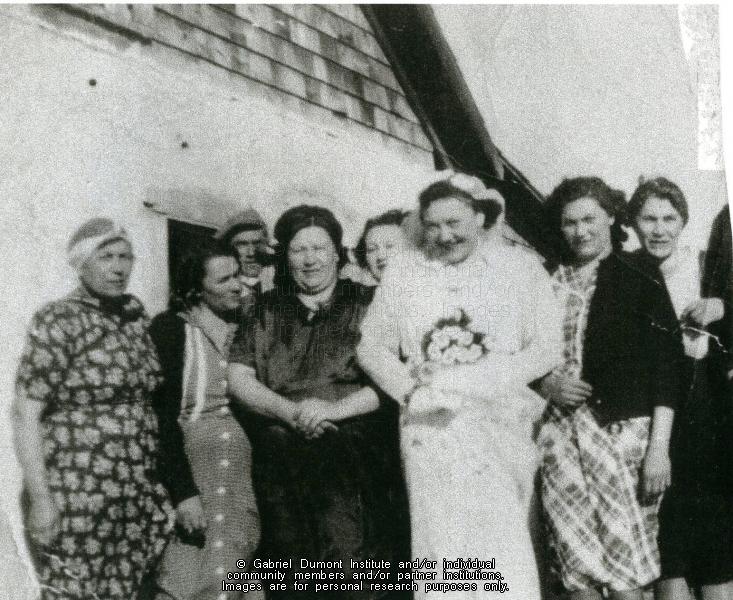 These are the children of Gilbert and Flora Roy (née Sinclair). It was taken on the wedding day of Caroline, the youngest daughter, in May 1952. From left to right are: Francoise (Mrs. George) Villebrun, Elisabeth (Mrs. Stanley) Kennedy, Harry Roy, Mary (Meme) Merasty, Monique (Mrs. Martin) Roy, Caroline, Maggie, and Marie Louise (Mrs. Joe A.) Laliberte. This image is to be used for research purposes only. The reproduction of this image in whole or in part is strictly prohibited without the permission of the copyright holder. Copyright for this image belongs to Lawrence Arnault, and/or the person(s) in the photograph, and/or their descendants. |