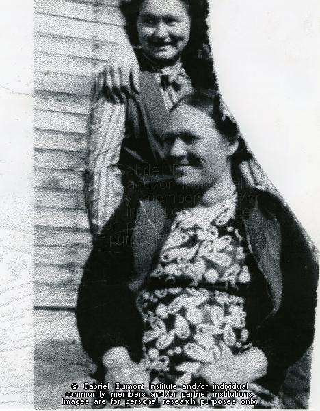 Seated is Aldina (Mrs. Clement) Laliberte, daughter of Pierre Marie Morin and Helen Lafond. Aldina died in 1966 at the age of 72. Standing behind is Margaret Geisbrecht, daughter of Caroline (Noo tsi kwiw) Lafond. This image is to be used for research purposes only. The reproduction of this image in whole or in part is strictly prohibited without the permission of the copyright holder. Copyright for this image belongs to Lawrence Arnault, and/or the person(s) in the photograph, and/or their descendants. |