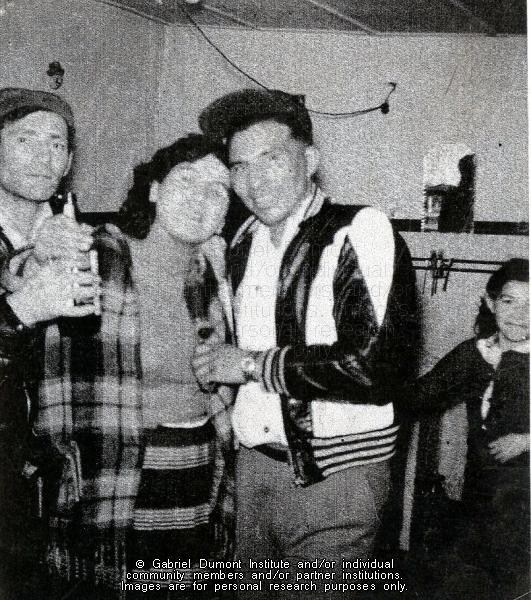 From left to right: Vital Morin, Judith Laliberte, and Louis Roy. They are celebrating the marriage of the daughter of Harry Morin. Harry was an older brother to Vital. This image is to be used for research purposes only. The reproduction of this image in whole or in part is strictly prohibited without the permission of the copyright holder. Copyright for this image belongs to Lawrence Arnault, and/or the person(s) in the photograph, and/or their descendants. |
