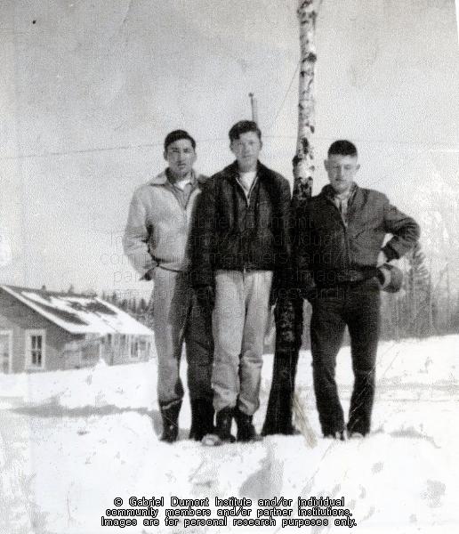 From left to right: Edward (Pa Lum) Kennedy, Etienne Morin (son of Harry and Virginia), and Gabriel (Martin) Roy. This image is to be used for research purposes only. The reproduction of this image in whole or in part is strictly prohibited without the permission of the copyright holder. Copyright for this image belongs to Lawrence Arnault, and/or the person(s) in the photograph, and/or their descendants.  |