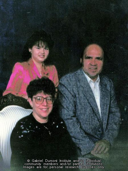 Description: Louis Morin, a grandson of Joseph Victor Laliberte, with his wife Mary Burnoeuf. Standing is his daugther Sherri, from a previous marriage. This image is to be used for research purposes only. The reproduction of this image in whole or in part is strictly prohibited without the permission of the copyright holder. Copyright for this image belongs to Lawrence Arnault, and/or the person(s) in the photograph, and/or their descendants.