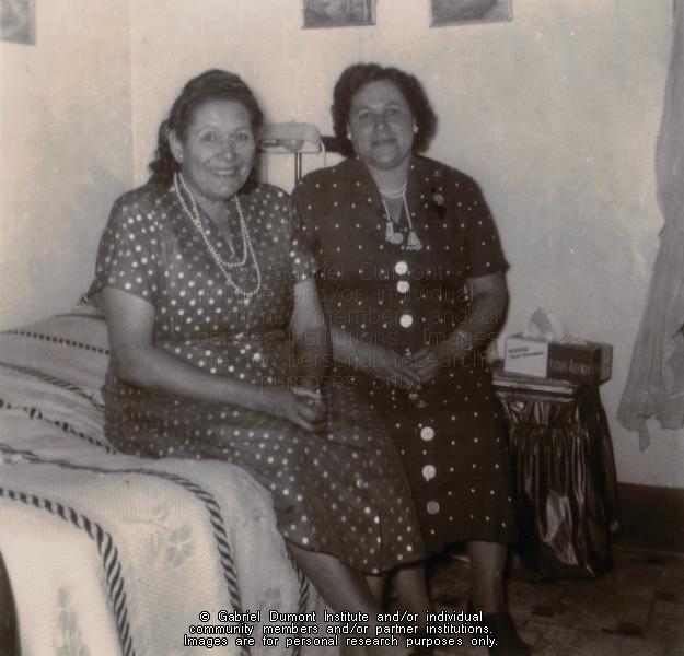 Description: Friends, Marie Delaronde (nee Piche) at left and Glecia Bear (nee Laliberte). This image is to be used for research purposes only. The reproduction of this image in whole or in part is strictly prohibited without the permission of the copyright holder. Copyright for this image belongs to Lawrence Arnault, and/or the person(s) in the photograph, and/or their descendants.