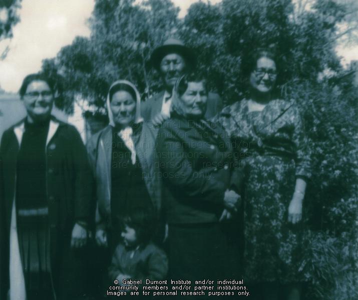 The children of Baptiste Merasty. Left to right: Delia Eldridge, Caroline Lafond, John Merasty, Mrs. George Roy and Alice Van Dyke. This image is to be used for research purposes only. The reproduction of this image in whole or in part is strictly prohibited without the permission of the copyright holder. Copyright for this image belongs to Lawrence Arnault, and/or the person(s) in the photograph, and/or their descendants. |