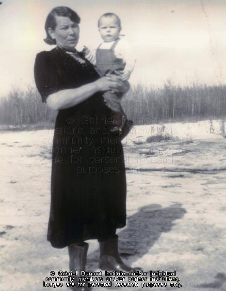| Description: | Vilna Fiddler (Mrs Bill Fiddler) carrying her grandchild from her son Billy. This image is to be used for research purposes only. The reproduction of this image in whole or in part is strictly prohibited without the permission of the copyright holder. Copyright for this image belongs to Lawrence Arnault, and/or the person(s) in the photograph, and/or their descendants. |