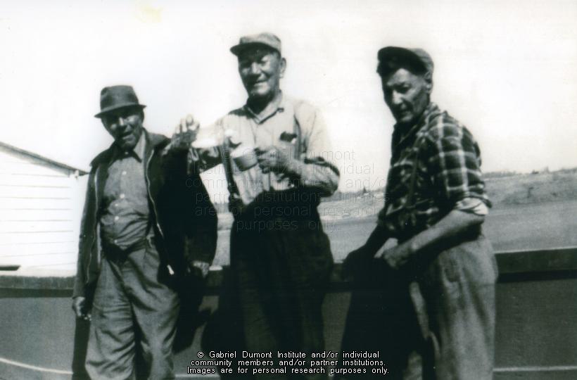Left to right: John Laliberte, John (Tsi-Jean) Merasty and Paul (Balloo) Morin. This image is to be used for research purposes only. The reproduction of this image in whole or in part is strictly prohibited without the permission of the copyright holder. Copyright for this image belongs to Lawrence Arnault, and/or the person(s) in the photograph, and/or their descendants. |