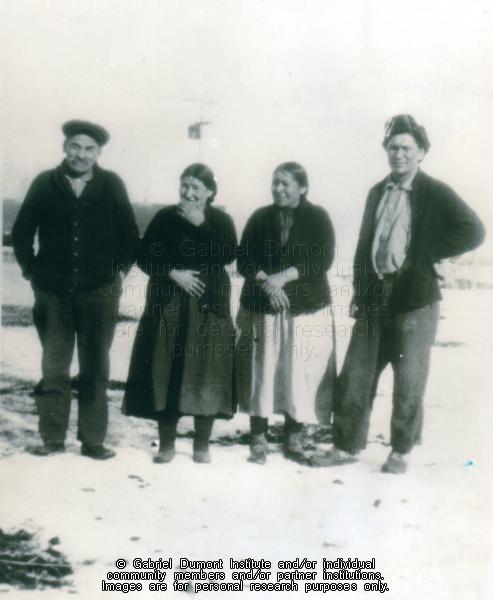 Mr and Mrs Ambroise Wolf of Mistawasis with John and Madeline Merasty of Green Lake. This image is to be used for research purposes only. The reproduction of this image in whole or in part is strictly prohibited without the permission of the copyright holder. Copyright for this image belongs to Lawrence Arnault, and/or the person(s) in the photograph, and/or their descendants. |