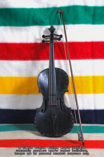 | Description: | Black fiddle with Hudson’s Bay Company blanket. |