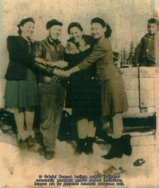 Left to right: Delia Merasty, Bill Lafleur, his wife Bella Merasty and Margaret L. Giesbrecht. This image is to be used for research purposes only. The reproduction of this image in whole or in part is strictly prohibited without the permission of the copyright holder. Copyright for this image belongs to Lawrence Arnault, and/or the person(s) in the photograph, and/or their descendants. |