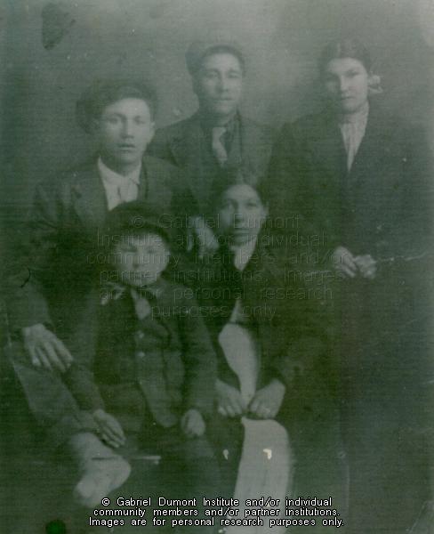 Back row, left to right: Walter Littlepine, John Merasty and Sophie Littlepine (nee Merasty, sister of John). Seated are Paul Littlepine with his aunt Madeline Merasty. This image is to be used for research purposes only. The reproduction of this image in whole or in part is strictly prohibited without the permission of the copyright holder. Copyright for this image belongs to Lawrence Arnault, and/or the person(s) in the photograph, and/or their descendants. |