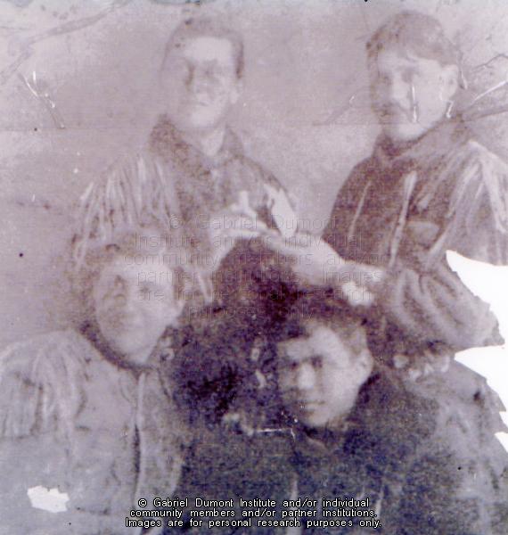 Starting at the top left, going clockwise: Johnny Sinclair, George Sinclair, John Laliberte (Tsi-koo-moo-shoom) and Alex Sinclair. The Sinclairs were the children of James N. Sinclair and Josephte Durocher. John Laliberte was a son of Virginia Merasty and Louis Laliberte. Virginia was a sister to the Sinclairs. This image is to be used for research purposes only. The reproduction of this image in whole or in part is strictly prohibited without the permission of the copyright holder. Copyright for this image belongs to Lawrence Arnault, and/or the person(s) in the photograph, and/or their descendants. |