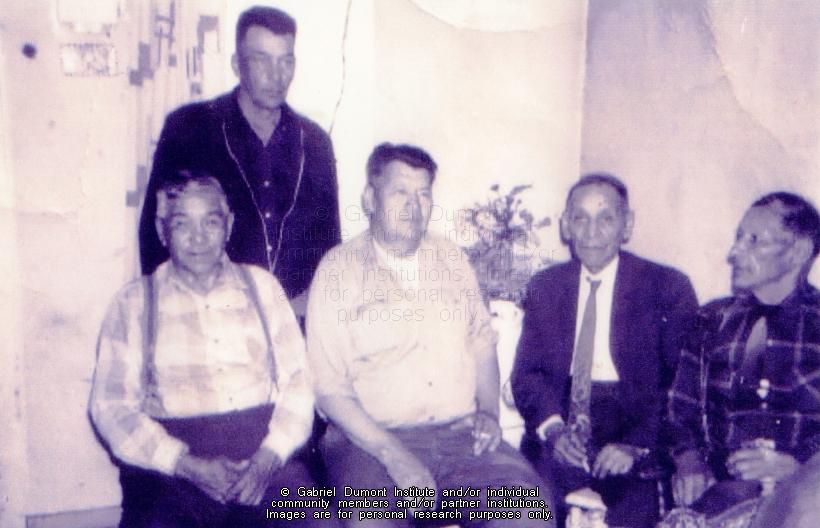 Description: Louis Short is the man standing in the background. Alex Sinclair, Gaspar (Blackie) Morin, and Paul (Balloo) Morin (brother to Gaspar) are sitting down. This photograph was taken by Rita Bratland at Agnes Roy’s funeral on May 27, 1967 at Green Lake.