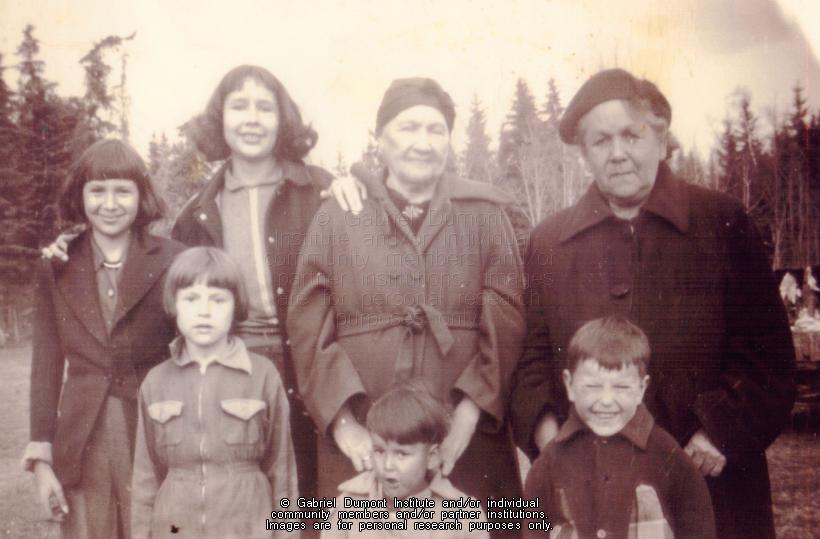 Description: The two older ladies are Catherine Roy (mother of Charlie Villebrun) at left, and Mrs Malboeuf (mother of Albert Malboeuf). This image is to be used for research purposes only. The reproduction of this image in whole or in part is strictly prohibited without the permission of the copyright holder. Copyright for this image belongs to Lawrence Arnault, and/or the person(s) in the photograph, and/or their descendants.