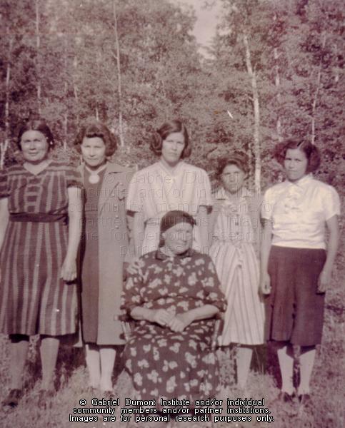 Seated is Catherine Roy, standing behind are her daughters: (left to right) Marie Louise Villebrun, Rosa Merasty, Vicky Laliberte, Hermeline Laliberte and Ernestine Merasty. This image is to be used for research purposes only. The reproduction of this image in whole or in part is strictly prohibited without the permission of the copyright holder. Copyright for this image belongs to Lawrence Arnault, and/or the person(s) in the photograph, and/or their descendants. |