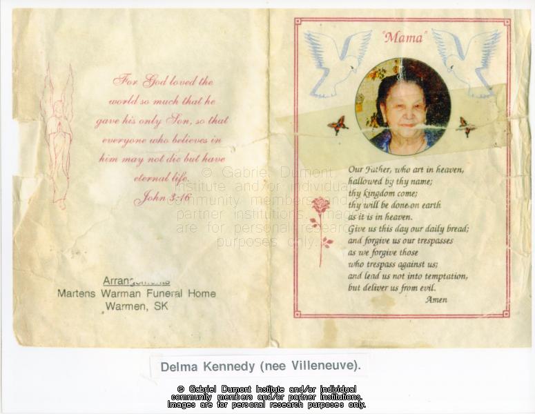 Description: Remembrances of Delma Kennedy, nee Villeneuve. This image is to be used for research purposes only. The reproduction of this image in whole or in part is strictly prohibited without the permission of the copyright holder. Copyright for this image belongs to Lawrence Arnault, and/or the person(s) in the photograph, and/or their descendants.