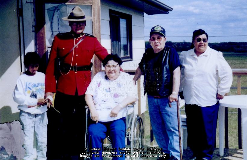 Left to right: Stanley (adopted by Madeline), Jerry Merasty, Madeline Laliberte (nee Merasty), Fred Merasty and Cecile Eagleman. This image is to be used for research purposes only. The reproduction of this image in whole or in part is strictly prohibited without the permission of the copyright holder. Copyright for this image belongs to Lawrence Arnault, and/or the person(s) in the photograph, and/or their descendants. |