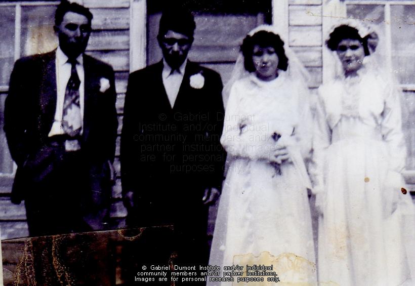 Wedding photograph of Max and Yvonne Desjarlais. Left to right: Peter Gladu, Max Desjarlais, Yvonne (nee Quintal) Desjarlais and Jenny Merasty. This image is to be used for research purposes only. The reproduction of this image in whole or in part is strictly prohibited without the permission of the copyright holder. Copyright for this image belongs to Lawrence Arnault, and/or the person(s) in the photograph, and/or their descendants. |
