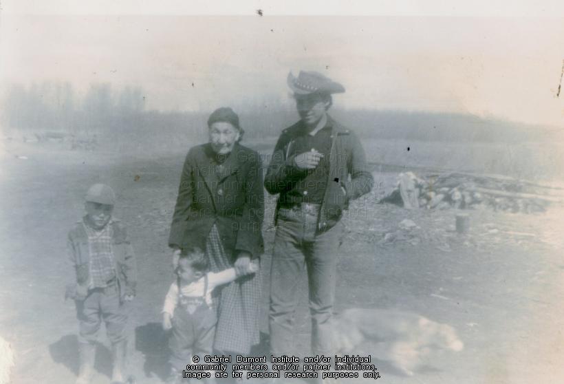 Jimmy Norman with his great-grandmother Flora Merasty and Bruno Bear. This image is to be used for research purposes only. The reproduction of this image in whole or in part is strictly prohibited without the permission of the copyright holder. Copyright for this image belongs to Lawrence Arnault, and/or the person(s) in the photograph, and/or their descendants. |