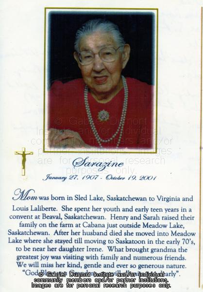 “Mom was born in Sled Lake, Saskatchewan to Virginia and Louis Laliberte. She spend her youth and early teen years in a convent at Beauval, Saskatchewan. Henry and Sarah raised their family on the farm at Cabana just outside Meadow Lake, Saskatchewan. After her husband died she moved into Meadow Lake where she stayed till moving to Saskatoon in the early 70’s, to be near her daughter Irene. What brought Grandma the greatest joy was visiting with family and numerous friends. We will miss her kind, gentle and ever so generous nature. God Bless you Grandma, we will all miss you dearly.”