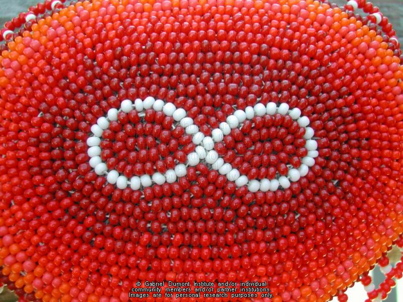 | Description: | Photograph of beaded barrette owned by Christi Belcourt. Red and white beading in the shape of a Métis infinity symbol