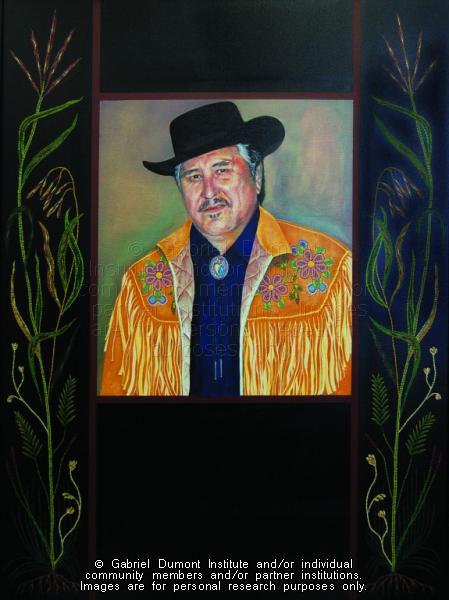 “The Great Métis of My Time project is a series of nine paintings that through exhibition are intended to bring awareness of Métis history, Métis traditional art and Métis contemporary issues to a public audience. The paintings, produced in acrylic on canvas, portray the stories and the lives of five prominent Métis individuals whose determination to seek justice for Métis rights have changed the course of history for the Métis Nation in modern times.” For further background information about these paintings, please visit the artist’s website at www.christibelcourt.com. Portrait of Harry Daniels, 2006 36” x 48” Acrylic on canvas Harry Daniels (1940-2004) was a Métis political activist and artist. Mr. Daniels is credited for ensuring that the Métis were recognized as one of Canada’s Aboriginal peoples in the repatriated Canadian Constitution in 1982. A very charismatic figure, Harry Daniels was an actor, academic, and the president of the Native Council of Canada (now the Congress of Aboriginal Peoples). He was an outspoken advocate for the rights of Métis people throughout his life. |