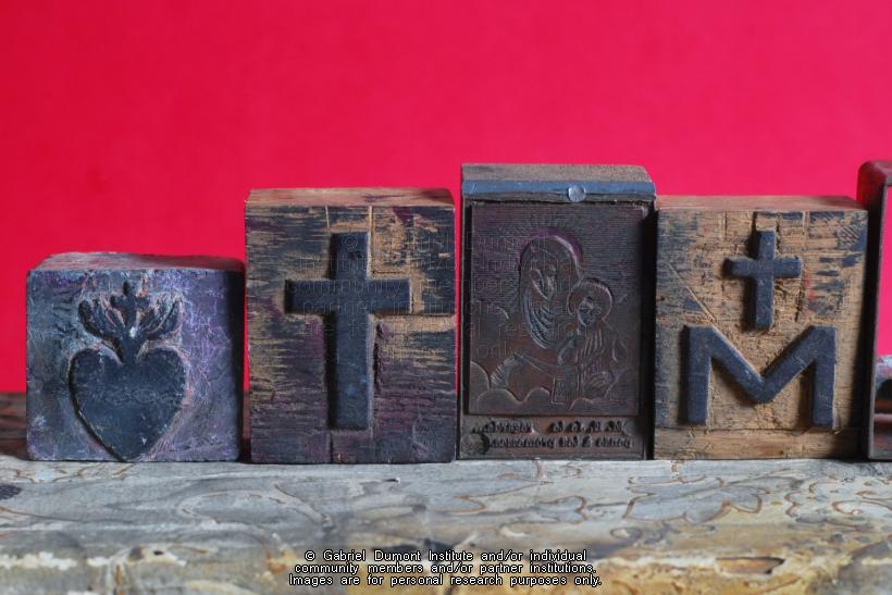 Description: Four religious stamps, all but one made of wood. They were acquired from Rose and Ric Richardson and was from the Keewatin Junction Station collection.