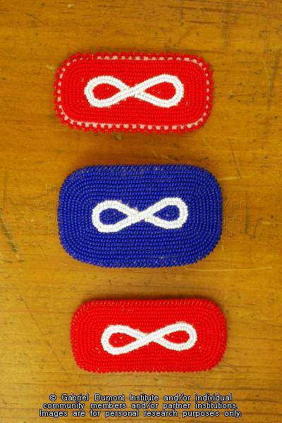 | Description: | Three barrettes, two red and one blue, beaded with the Métis infinity image. |