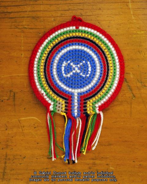 Description: Circular cross stitched wall decoration with Métis infinity symbol.