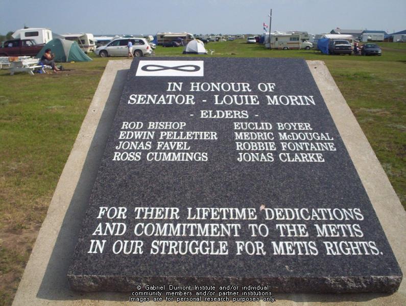 "In Honour of Senator Louise Morin/Elders:Rod Bishop, Euclid Boyer, Edwin Pelletier, Medric McDougal, Jonas Favel, Robbie Fontaine, Ross Cummings and Jonas Clarke. For their lifetime dedications and commitment to the Métis in our struggle for Métis rights."  |